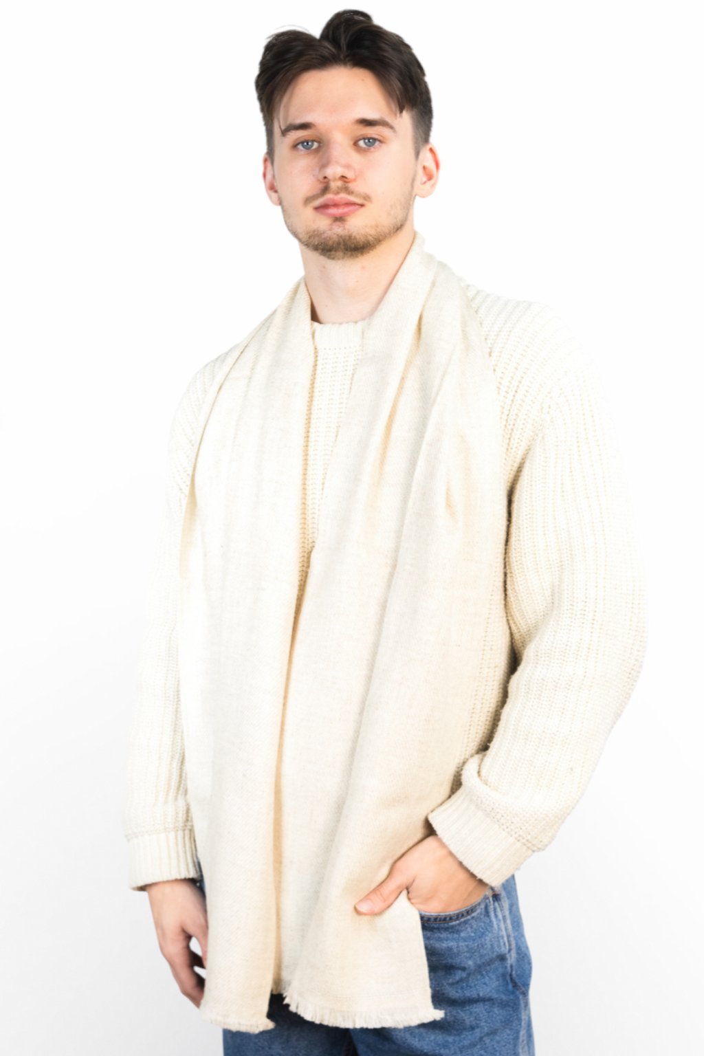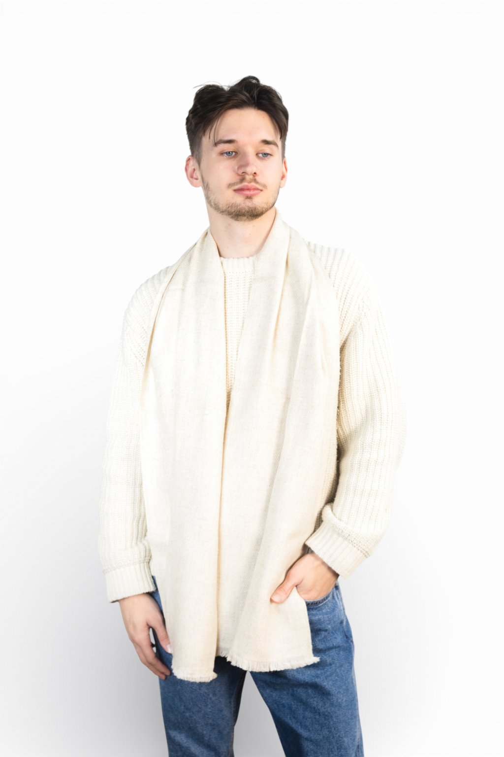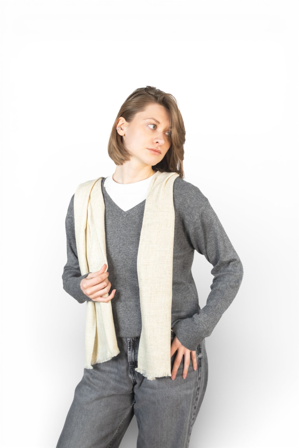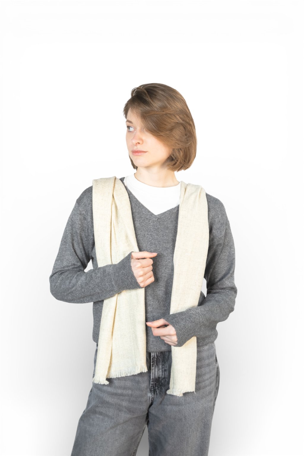 Jemná 100% kašmírová šála upletená z 8 vrstev s šedo-bílým vzorem z přírodních barev. Nejjemnější, dlouhá vlákna se starají o opravdu heboučký a měkký pocit a zajistí, že šála nebude časem chlupatět, bude držet tvar a skvěle padne kolem krku. Přírodně barvená. Vhodná pro muže i ženy.